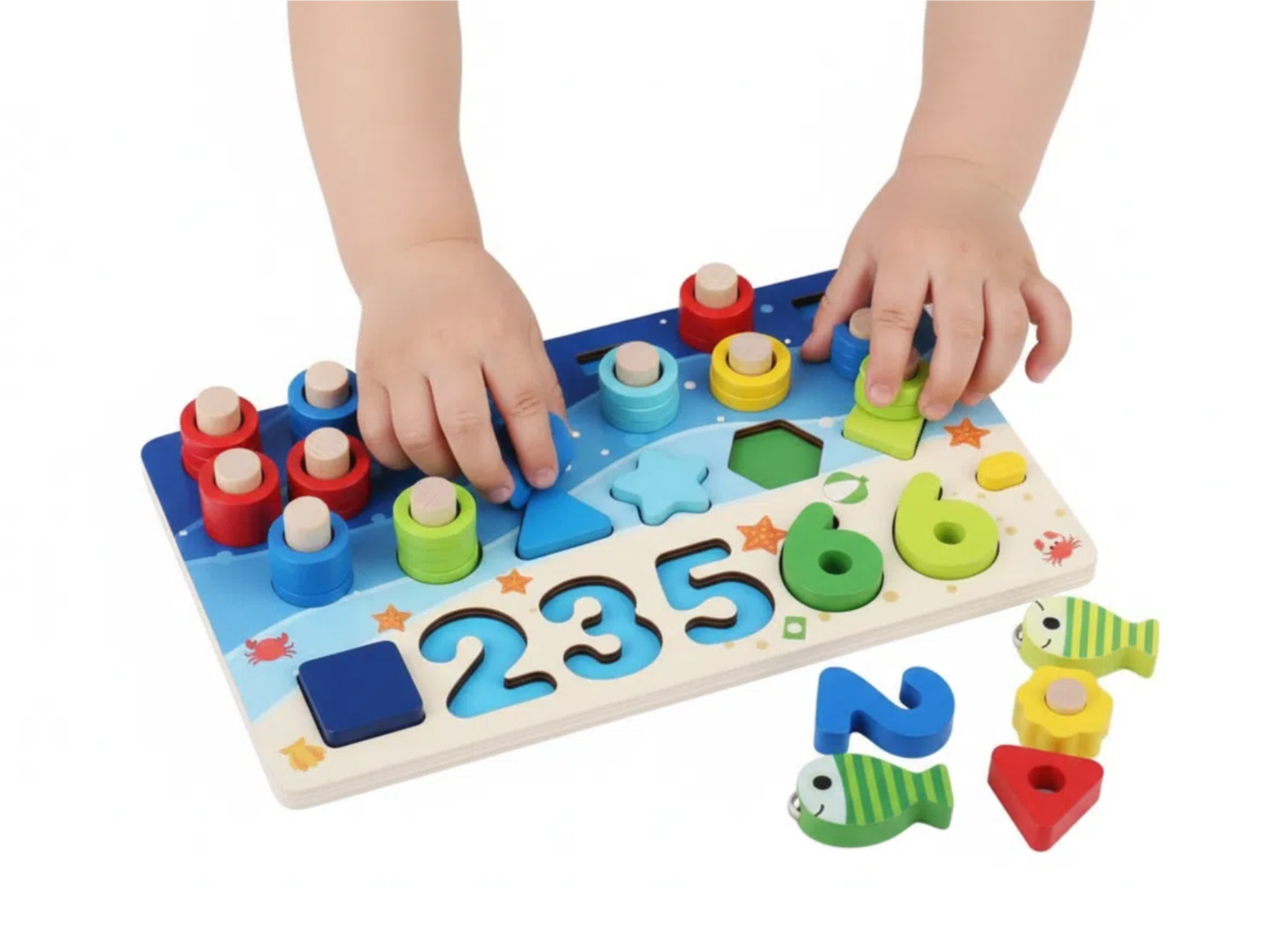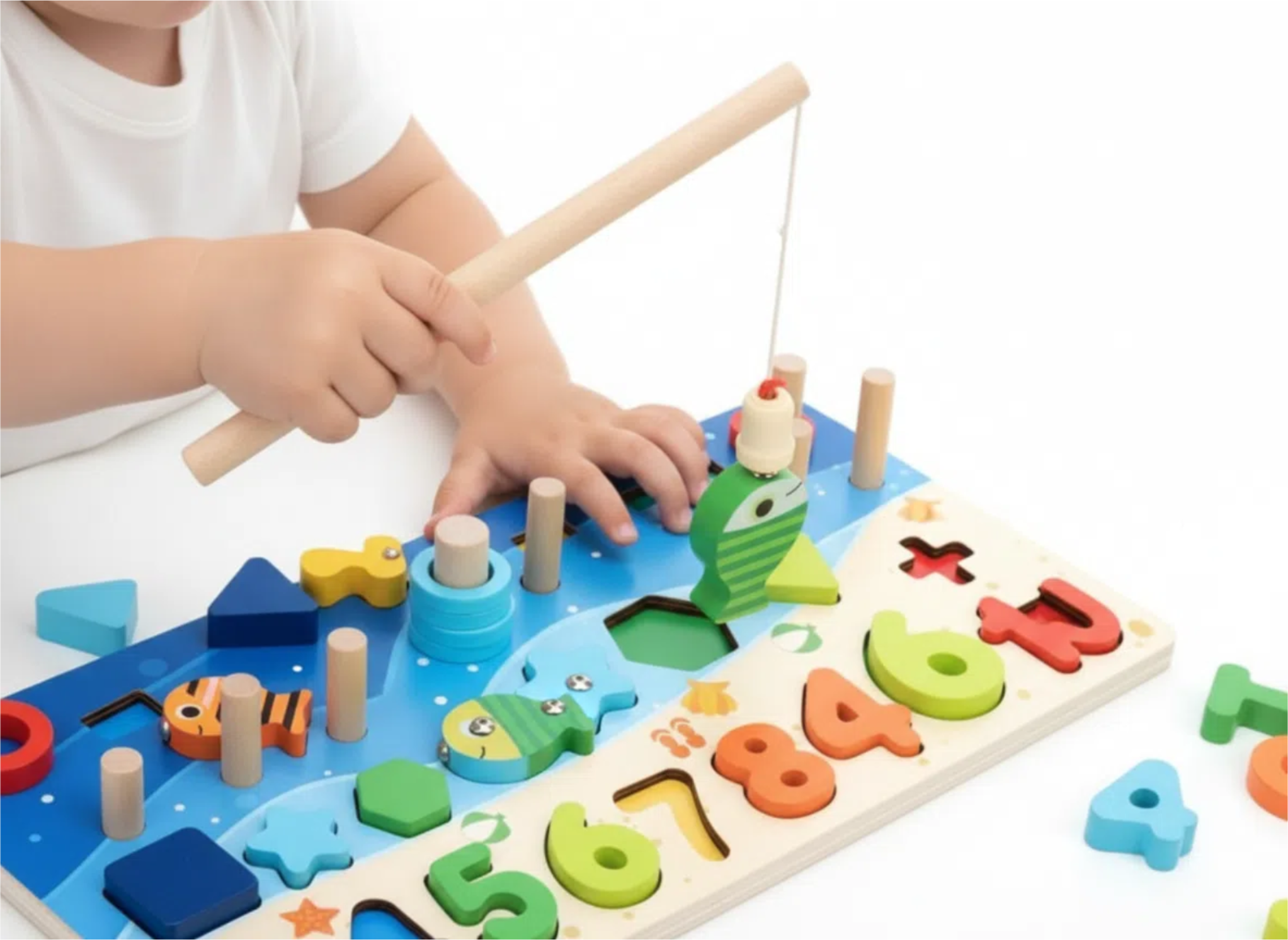 Children can enjoy color sorting, number counting, shape matching, stacking blocks, and a fun magnetic fishing game — all in one educational board.
