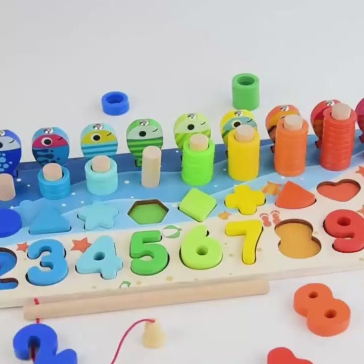 This multifunctional board combines counting games, shape sorting, stacking, magnetic fishing, and color recognition to encourage cognitive development and hand-eye coordination from an early age.